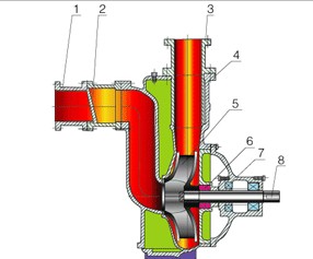 1進(jìn)口接管 2進(jìn)口單向閥 3出水接管 4泵體 5葉輪 6機(jī)械密封 7軸承座 8泵軸
