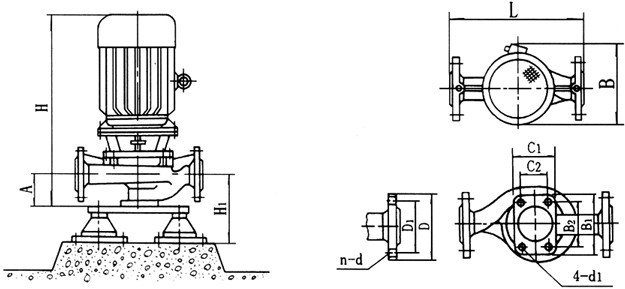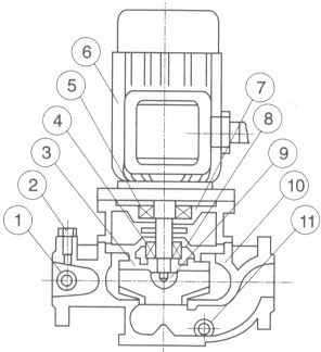 1.泵為立式結(jié)構(gòu),進(jìn)出口口徑相同,且位于同一中心線(xiàn)上,可象閥門(mén)一樣安裝于管路之中,外形緊湊美觀,占地面積小,建筑投入低,如加上防護(hù)罩則可置于戶(hù)外使用.