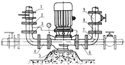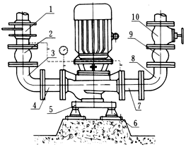 1.進(jìn)口閥門(mén) 2.柔性接頭 3.彎管 4.直管 5.聯(lián)接板 6.隔振器 7.直管 8.彎管 9.柔性接頭 10.出口閥門(mén) |