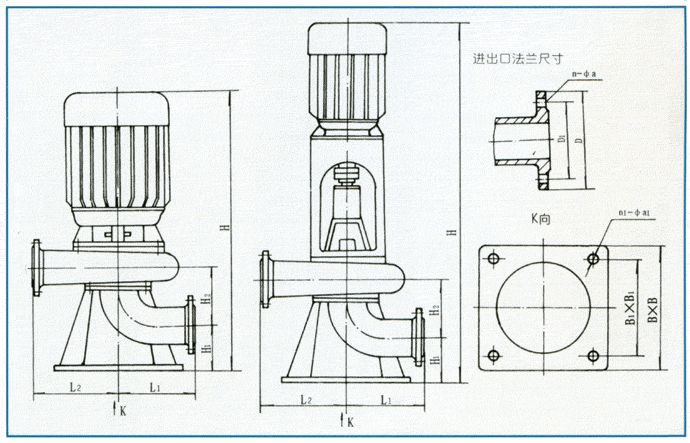 該系列泵具有兩種結構形式,一是電機與泵直接同軸,二是采用聯(lián)軸器聯(lián)接,電機采用標準立式電機。其結構圖如下,每種結構形式具有兩種底座連接形式,一是進口水平吸入,具有轉(zhuǎn)角功能,可根據(jù)使用要求,進出口安放成0°、90°、180°、270°,便于管路連接,二是進口軸向吸入,便于立式安裝。