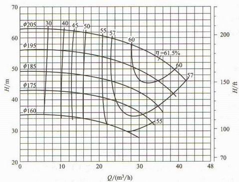 國外很多泵廠及國內(nèi)引進(jìn)技術(shù)生產(chǎn)的一些泵,往往提供全特性曲線,如圖2-4所示,該曲線包括不同葉輪直徑下的H-Q線、