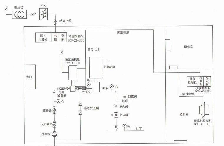 如果是對舊泵站進行PCP改造,可以保留原注水泵入口閥門及管線,在注水泵入口處上接入增壓泵調(diào)控系統(tǒng),見圖6-26,該圖是典型的平面布置圖。