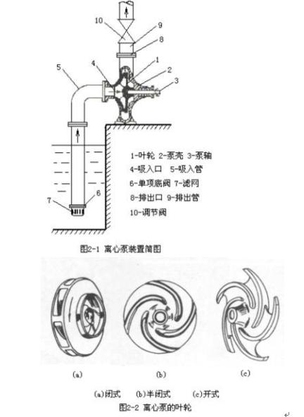 圖2—1是簡(jiǎn)化了的離心泵工藝系統(tǒng),它由離心泵、吸人和排出管、底閥、擴(kuò)散管等組成。離心泵主要由葉輪、葉片、泵殼、泵軸、填料筒等組成。