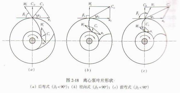 當葉片出口是徑向時,B2=90.,如圖2-18(b)所示。當B1和B2均小于90.時,葉片與旋轉(zhuǎn)方向呈后彎式葉片,如圖2-18(A)所示。當B2大于90 。時,葉片與旋轉(zhuǎn)方向呈前彎葉片,如圖2-18(c)所示。因此,B2角的大小反映了葉片的彎度,是構(gòu)成葉片形狀和葉片能的一個重要數(shù)據(jù)。實際工程中使用的離心泵葉輪,