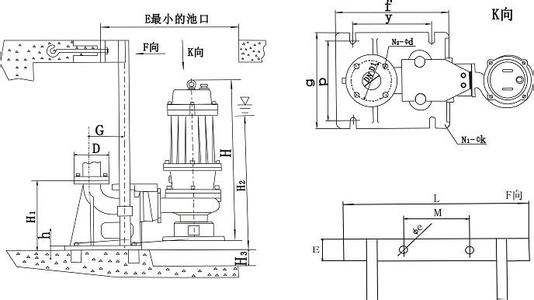 潛水電泵出水法蘭與出水管路系統(tǒng)自動對接的自動耦合裝置,由潛水電泵出水法蘭、附加耦合法蘭和出水管座進口法蘭組成,在附加耦合法蘭和出水管座進口法蘭的兩側(cè)各有一對楔卡且楔點的位置在法蘭的水平中心線附近。當潛水電泵從水坑上方降落時,附加耦合法蘭兩側(cè)的楔卡和出水管座進口法蘭兩側(cè)的楔卡就卡到一起,在潛水電泵自重和楔卡斜面的作用下,兩個法蘭面緊緊地貼在一起,就好比兩個法蘭的兩側(cè)用兩個螺栓上緊了一樣,潛水電泵的水壓再大也不能推開法蘭面而大量漏水。當潛水電泵從水坑內(nèi)往上提起來時,兩對楔卡能夠沿斜面方便的脫開,從而實現(xiàn)自動耦合裝置的功能。它可以在方便潛水電泵自動裝拆的同時,解決耦合的兩個法蘭之間大量漏水的問題,從而節(jié)約能源。 (2)自動耦合式潛污泵的安裝方式 自動耦合式潛污泵安裝主要是耦合裝置的安裝和泵的吊裝。安裝前在泵吊環(huán)上系上鏈鎖,供起吊與下泵之用。 耦合裝置的安裝步驟:偶合架用四個螺栓固定于泵體;出水管固定于基底;定位錐體安裝于出水管座;導(dǎo)管下端套在定位錐體上,上端套在導(dǎo)桿架的橡膠塊上;*后將導(dǎo)桿架固定于水池壁。橡膠塊的作用:用導(dǎo)桿架上的螺釘調(diào)節(jié)橡膠塊的軸向壓緊程度,使橡膠塊的直徑與導(dǎo)桿內(nèi)徑相吻合,讓導(dǎo)桿穩(wěn)定。 泵的安裝步驟:起吊水泵,將耦合架上的導(dǎo)向孔對準導(dǎo)桿,徐徐放下吊索,使泵沿導(dǎo)桿自由下滑,泵體出口與出水管座口即自動對準;松開吊索,在泵的自重作用下,使耦合架上的斜面與出水管座上相對應(yīng)的斜面楔緊,泵體法蘭面與出水管座密封面即可緊密貼合,這樣就實現(xiàn)了泵和出水管座的自動耦合。需要起吊時,只需拉起吊索,使泵和耦合架與出水管脫開,將泵與耦合架沿導(dǎo)桿拉起即可。