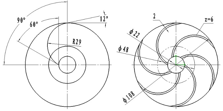 根據(jù)導(dǎo)葉片座標(biāo)圖和裝配圖上的導(dǎo)流殼軸面圖,就可以畫出導(dǎo)流殼零件圖了。如圖2-10所示。你們可能注意到,在畫這個(gè)葉片時(shí),沒有用方格網(wǎng)設(shè)計(jì),這是我把它簡化了,簡化是有條件的,這就是流面基本是平面,這個(gè)導(dǎo)流殼的上下流線都在平面內(nèi),所以就可以不通過方格網(wǎng)而直接作圖了。既然是在平面上作圖,那就是真實(shí)的葉片安放角,為什么要說是簡化畫法呢,那是因?yàn)榱骶還有一小部分是在曲面上,在曲面上的葉片安放角就只有通過方格網(wǎng)來測量了,當(dāng)然也可以在立體圖中進(jìn)行測量,比如現(xiàn)在標(biāo)注的出口安放角60度就不是真實(shí)的出口安放角,你們可以畫立體圖進(jìn)行測量,估計(jì)在70度左右。QJ型井用潛水泵(深井泵)